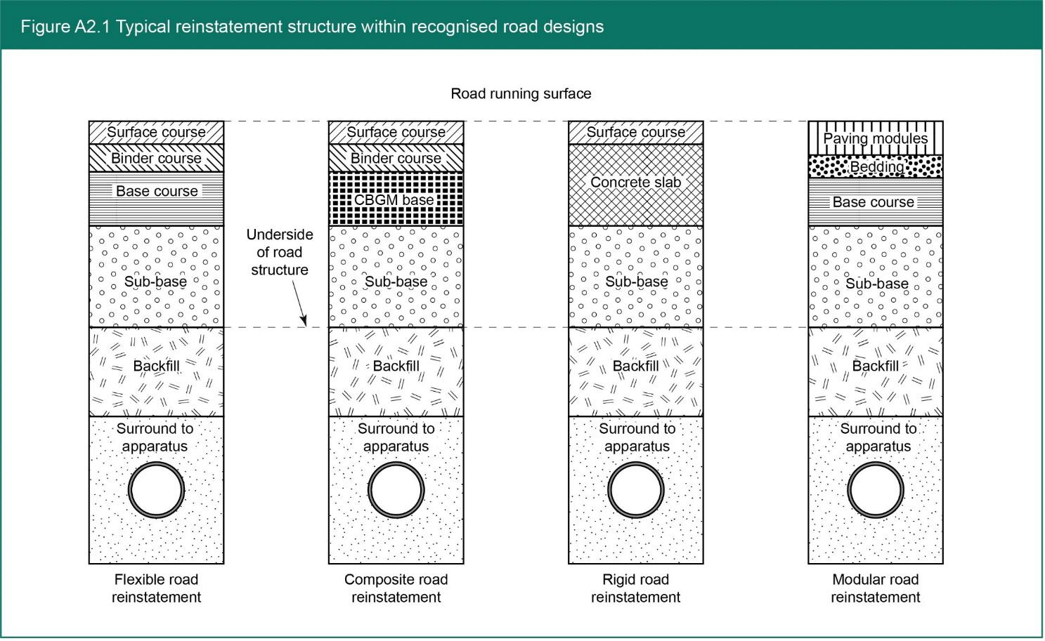 - For the purposes of defining permissible material options, layer thickness etc., this Code classifies road structures as being of flexible, composite, rigid or modular design. Road structures assumed to be representative of each of these designs are shown in Figure A2.1. For each design, a typical reinstatement structure identifying the principal structural layers is also shown.
