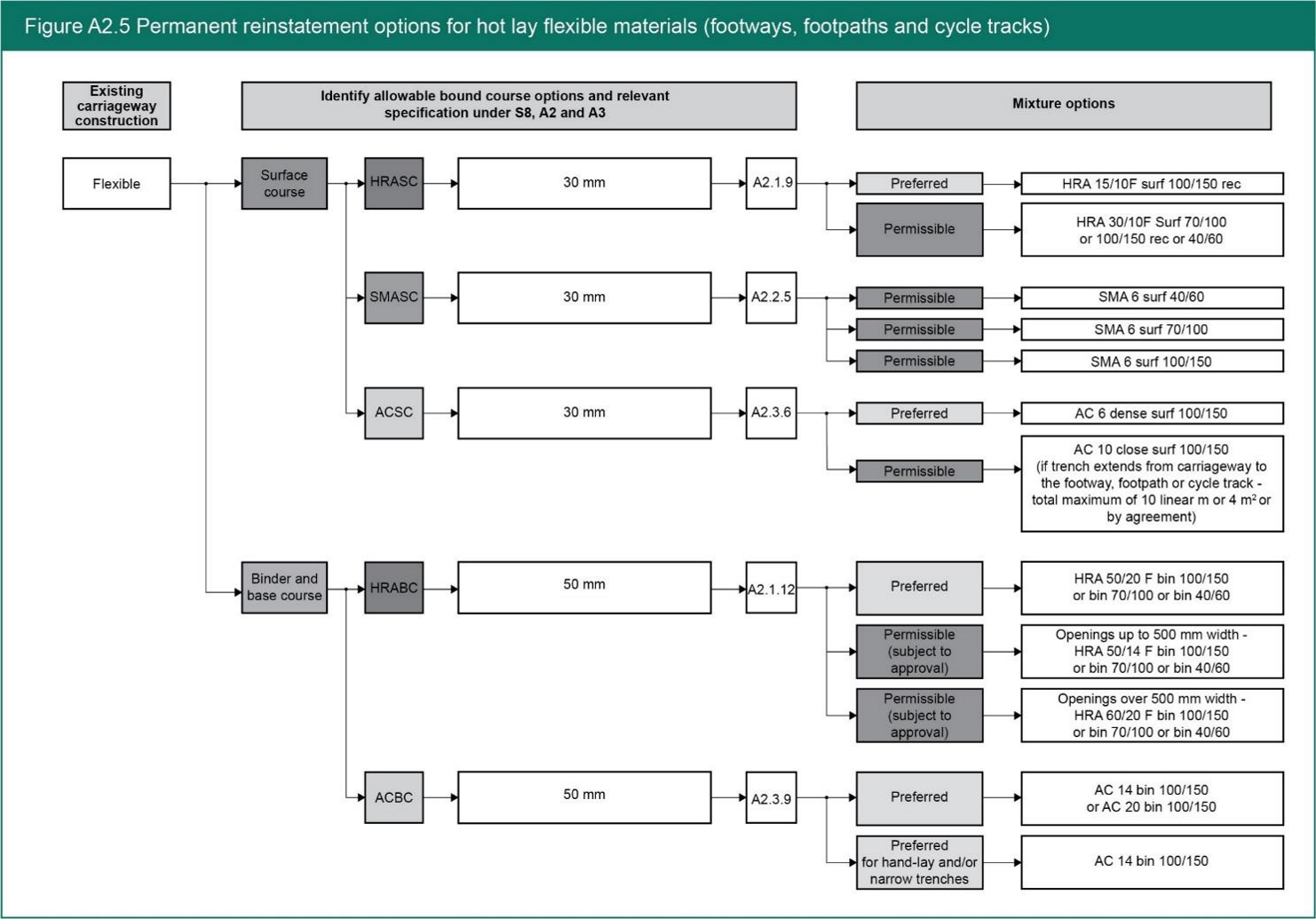 - The overall process for selecting the correct materials to reinstate flexible roads and footways is particularly complex at the reinstatement design selection stage. Figure S0.1 provides a generic overview of this process, but to assist practitioners, Figures A2.3, A2.4 and A2.5 respectively set out the summarised overall processes specific to: